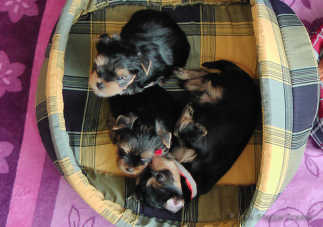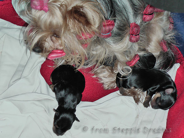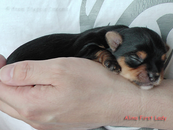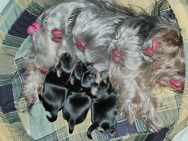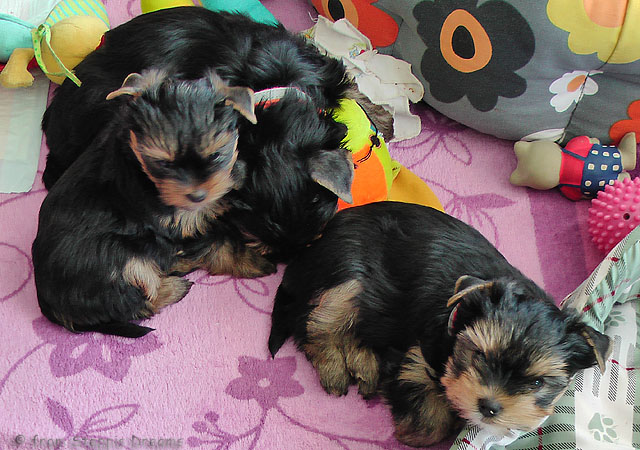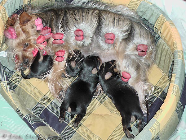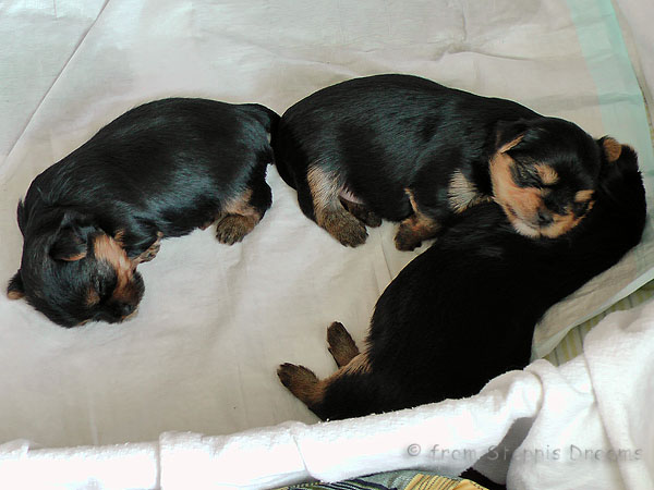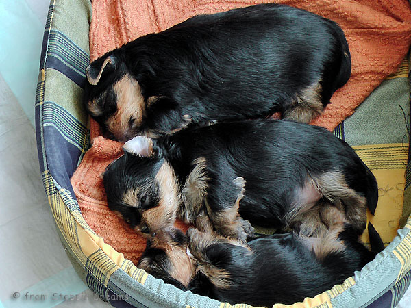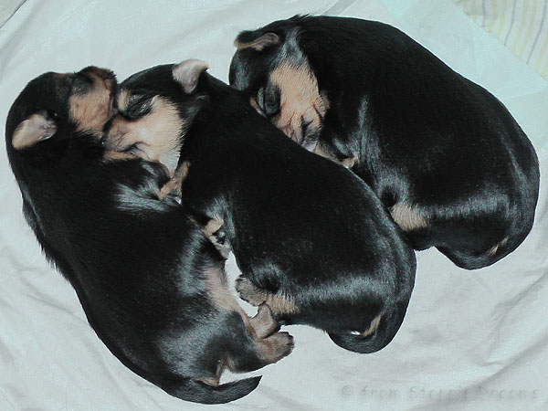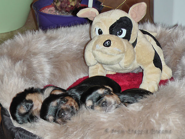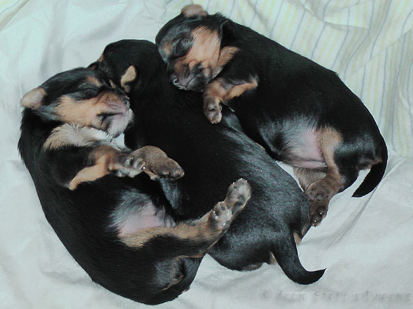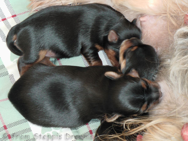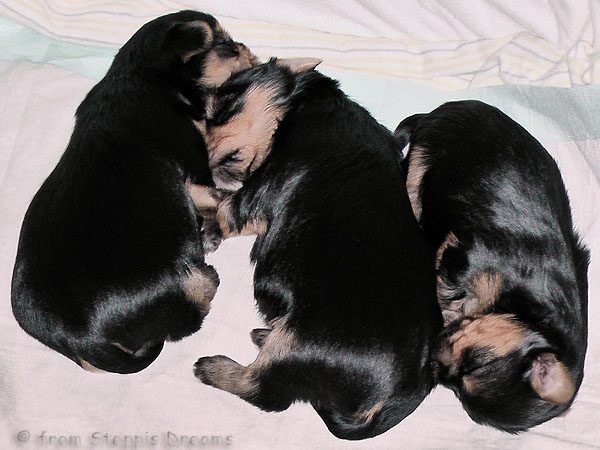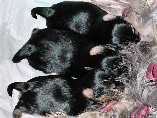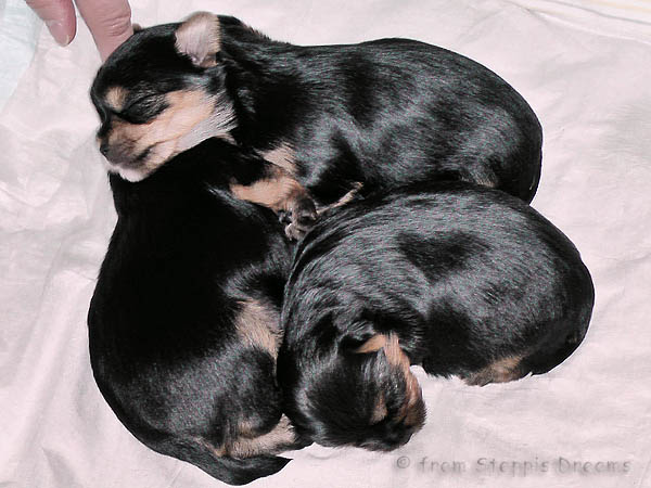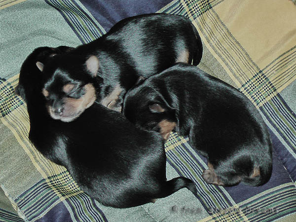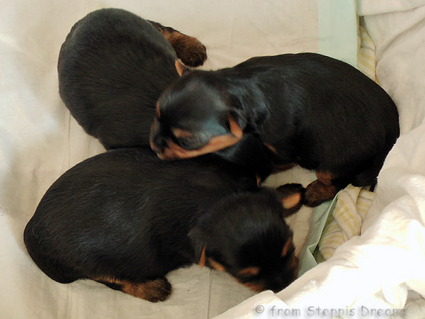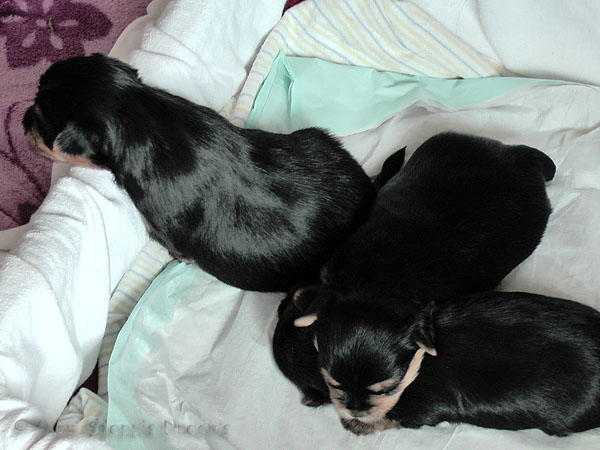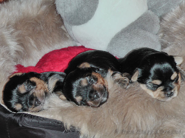 Alle drei Welpen haben ihr Geburtsgewicht weit mehr als verdreifacht . Allen Welpen und Mimmy geht es gut und sie fühlen sich wohl.