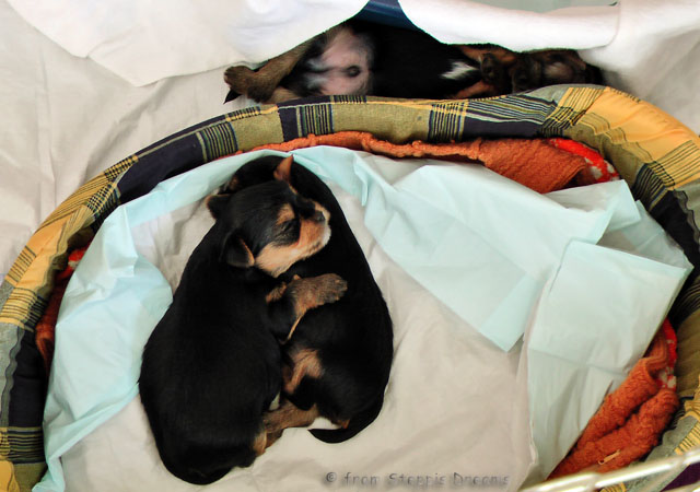 Alle drei Welpen haben ihr Geburtsgewicht weit mehr als vervierfacht. Allen Welpen und Mimmy geht es gut und sie fühlen sich wohl. Sie sind dabei schon etwas mobiler und versuchen alles, um der Wurfkiste zu entfliehen .