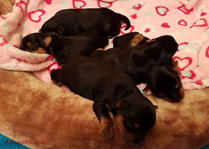 Alle Welpen entwickeln sich wie es sein soll. Funny Fudgee (Nr.2) hat Francy Flash (Nr.4) im Gewicht überholt .